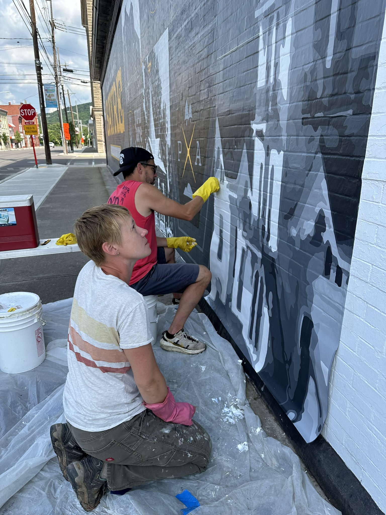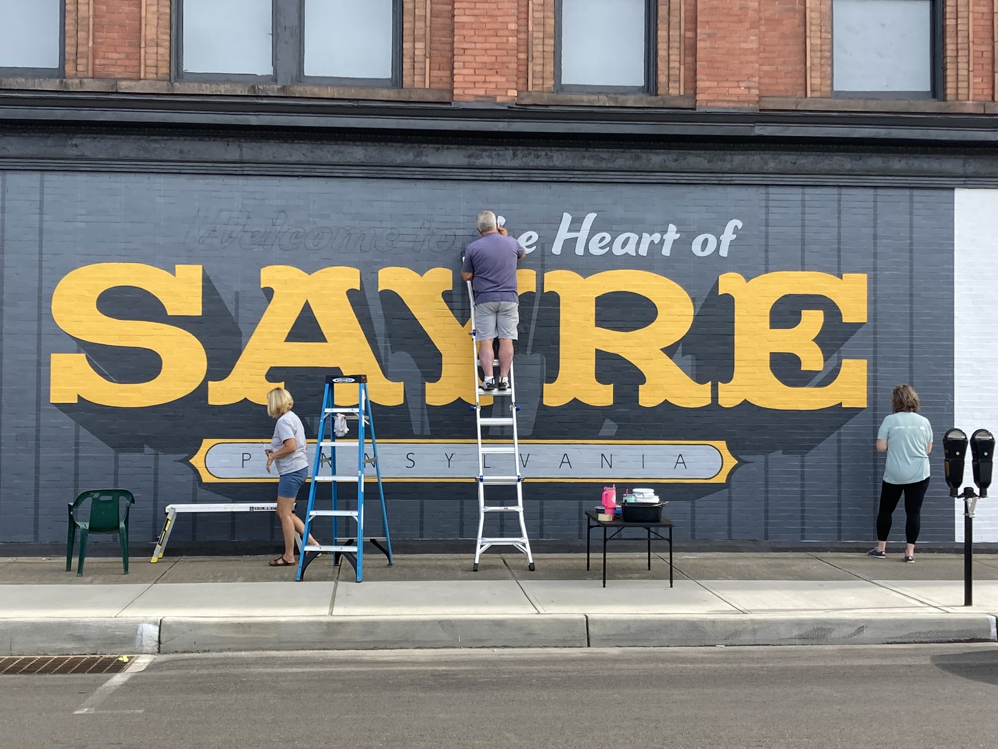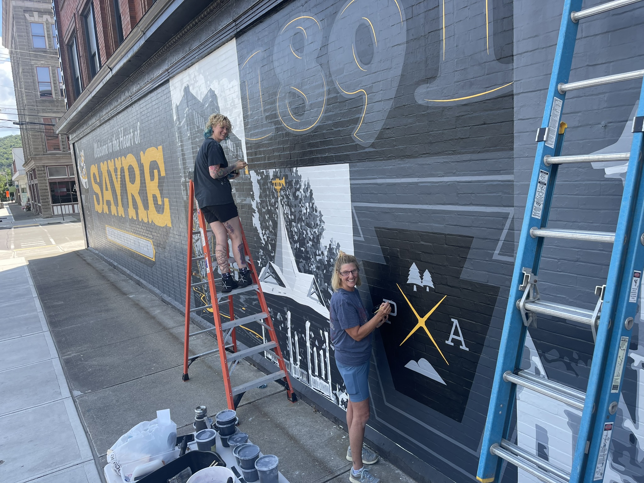 Sayre’s largest mural, Welcome to the Heart of Sayre, was completed in July 2024 through an Artist-in-Residence program funded by the Pennsylvania Council on the Arts (PCA) and generous contributions to Friends of Valley Arts (FoVA). This community-focused project transformed an 88-by-12-foot wall in the downtown business district with the involvement of over 250 residents and numerous local businesses.