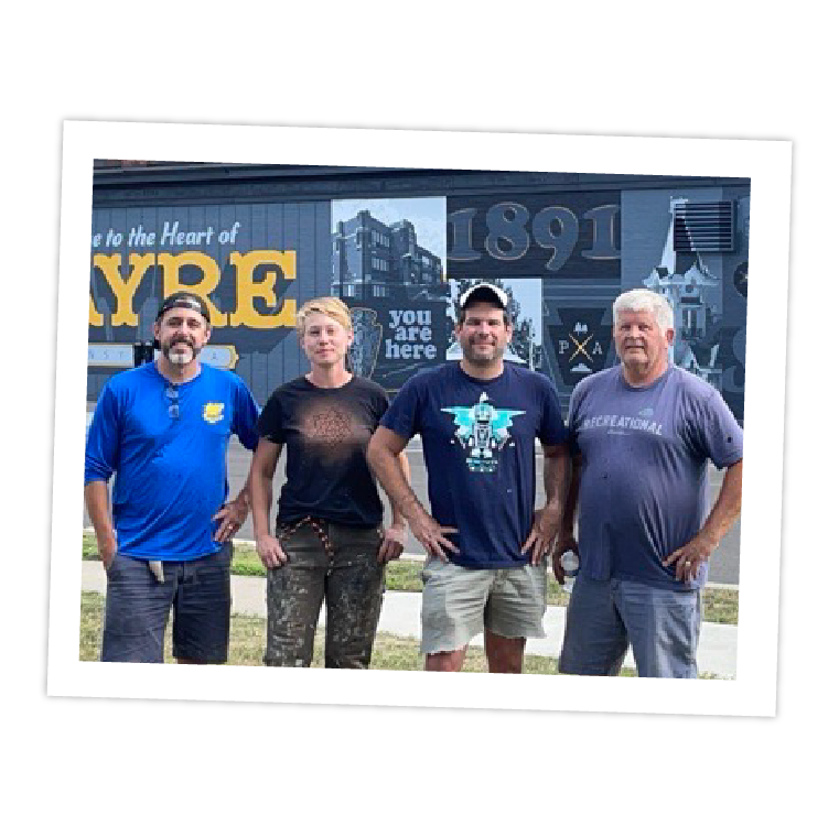 The mural’s production blended traditional and innovative methods. The 30-foot “Welcome to the Heart of Sayre” section was stenciled and painted directly onto the wall, while the remaining 60 feet were created using Polytab—a modern technique involving pre-painted fabric panels adhered with acrylic gel. This method allowed much of the mural to be developed as “paint-by-number” panels, painted indoors during winter community paint sessions. Installed between June and July, the mural now serves as a vibrant downtown landmark, telling the visual story of Sayre’s unique history and community spirit