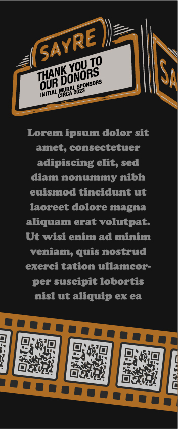 The iconic Sayre Theatre marquee headlines our gratitude to all of the donors who graciously contributed to Sayre’s Downtown Mural projects. The Sayre Theatre, had its grand opening New Years Eve 1914 and is still a cultural hub of town.